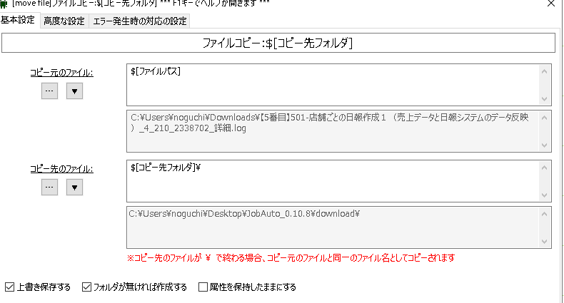 ダウンロードフォルダから任意のフォルダへコピーする共通部品も公開しています。そちらもご利用ください。こちらでご確認いただけます。