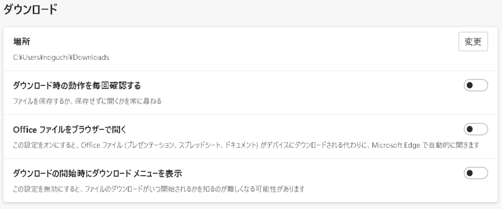 ダウンロードに関する設定はすべてオフにしておきましょう。またダウンロード先のフォルダ(場所)はデフォルトの設定の「C:\Users\windowsのログインユーザー名\Downloads」にしておくのがおすすめです。