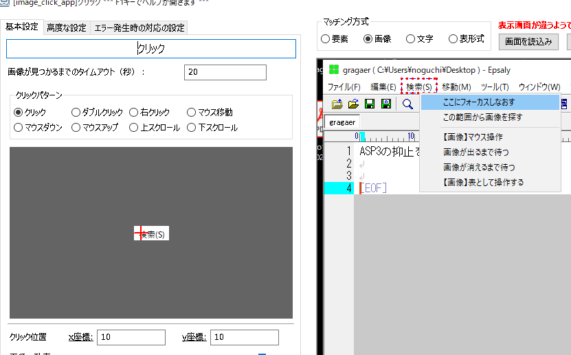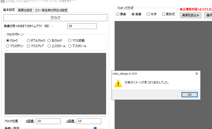 アプリ操作でマッチング方式で「画像」を使ってアクションを新しく作成するときに、画像が見つかりませんというかならずエラーが発生します。ほかのマッチング方式では発生していません。