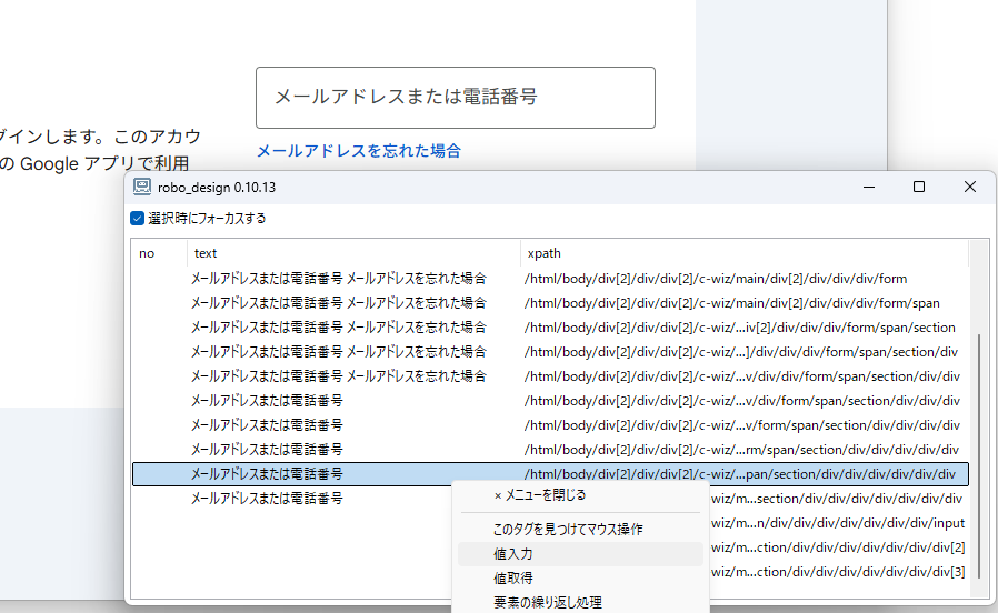 手動設定に変更します。手動設定に変更してブラウザ起動アクションから再実行し、対象の画面を表示してください。F2キーを押すと要素の一覧が表示されます。操作したい要素を一覧から選択、右クリックを押してメニューを表示します